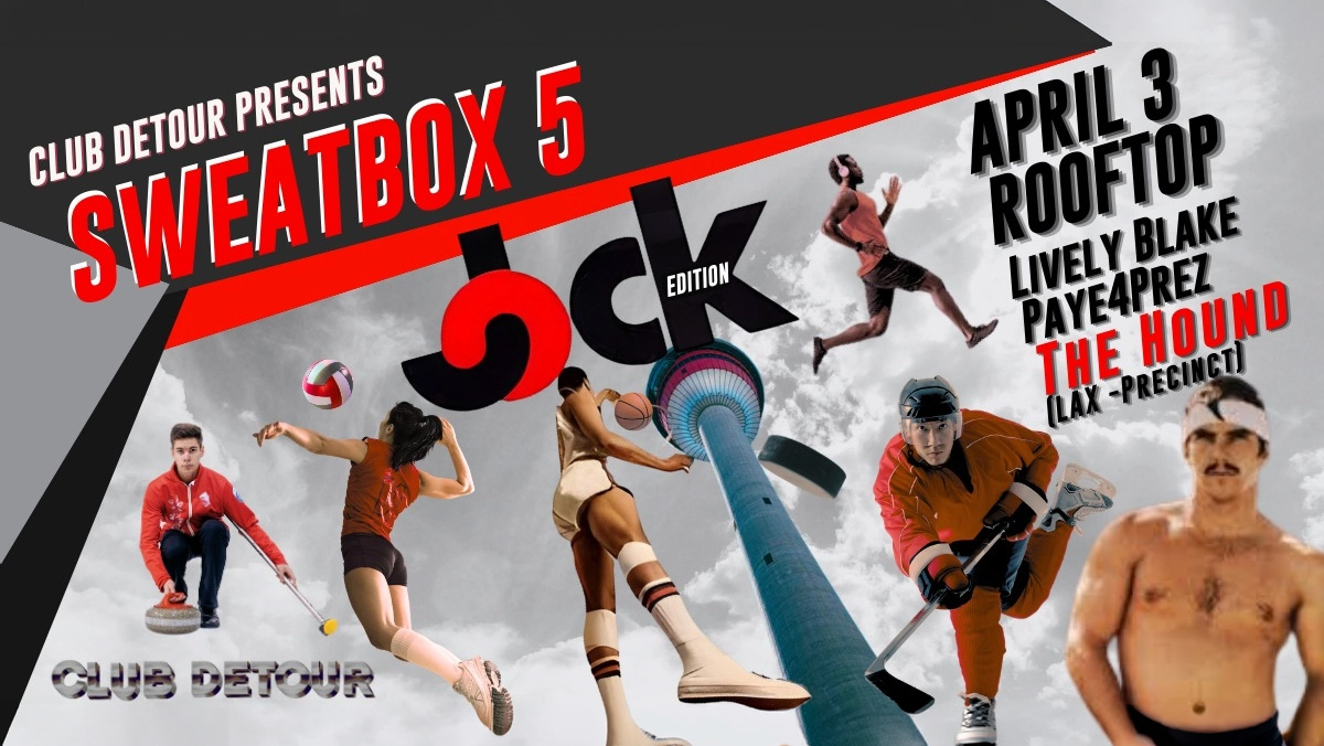 Club Detour presents SWEAT BOX 5: JOCK EDITION Five years deep and hotter than ever. SweatBox returns to kick off a weekend of sport, sweat, and community, and this year we’re going bigger, faster, stronger as we take over Rooftop YYC. This is the party where jocks, fans, athletes, and admirers collide. Expect bodies, heat, bass, and connection — all on the ROOFTOP. On the decks: Your resident hockey bro @livelyblake83 local icon @paye4prez and LA special guest @thehound